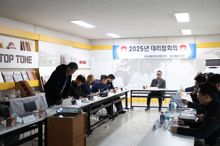 유신메라민공업 '2025년 대리점 회의' 댓글 0건 1,664 작성일2025-02-12 14:45 Main text 2025년도 2월 12일 유신메라민공업 대리점 회의를 진행하였습니다. TOP TONE 샘플북 New Collection & New Catalogue 제작 25.12.24 유신메라민공업 '2025년 방침관리 회의' 25.01.02