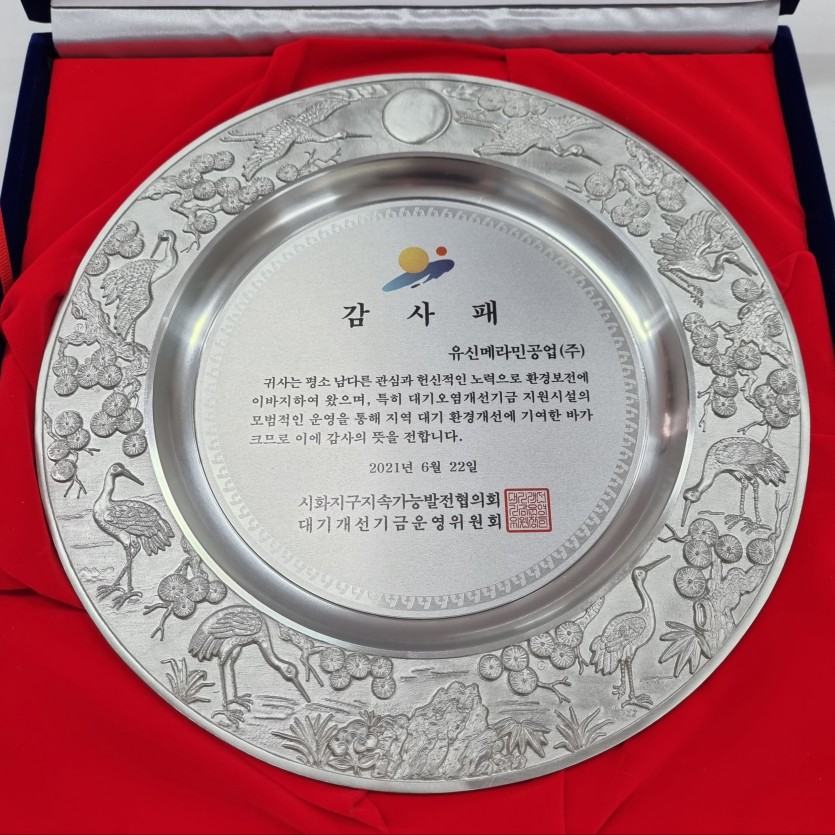 2021년 6월 22일 시흥환경녹색지원센터에서 RTO 및 스크러버 관리 등에 대해 전문기술위원 평가를 통해 우수 사업장으로 선정되었습니다.